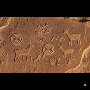 Petroglyphs are rock carvings made thousands of years ago. They show animals, humans, and strange symbols. Some are over 100,000 years old.